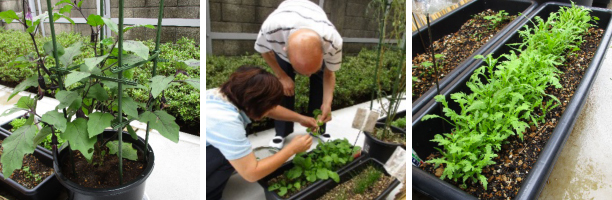 野菜のお手入れです。現在 ミニトマト・わけぎ・みつば・かぶ・春菊です。次は、ナスが実をつけています。